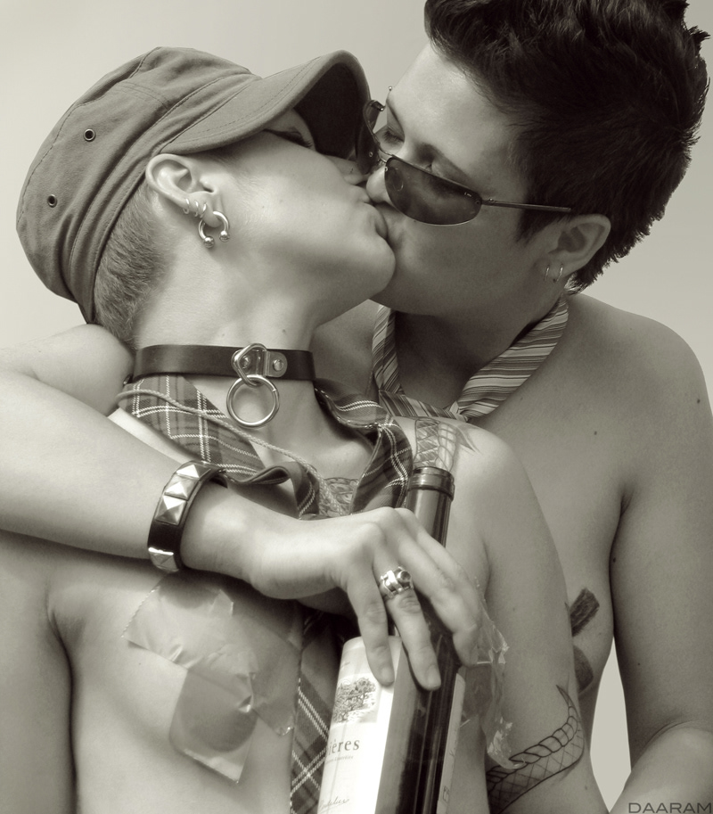 2 Girls and a Kiss: Two young women kissing in the street. Gay Pride Paris. 06/2006