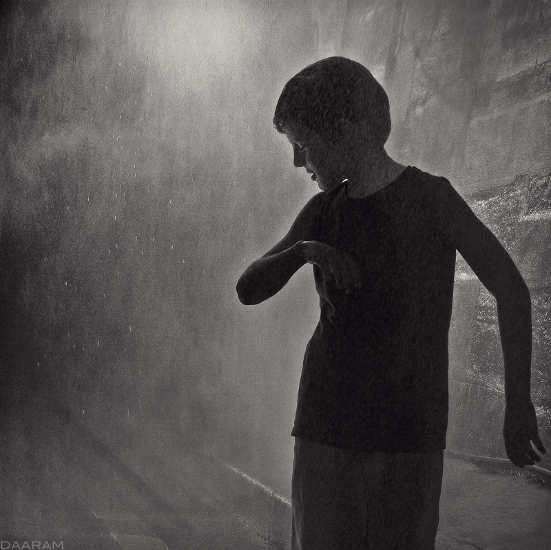 Dreamer: Young boy playing under the water sprays at "Paris plage" summer event. 09/2009